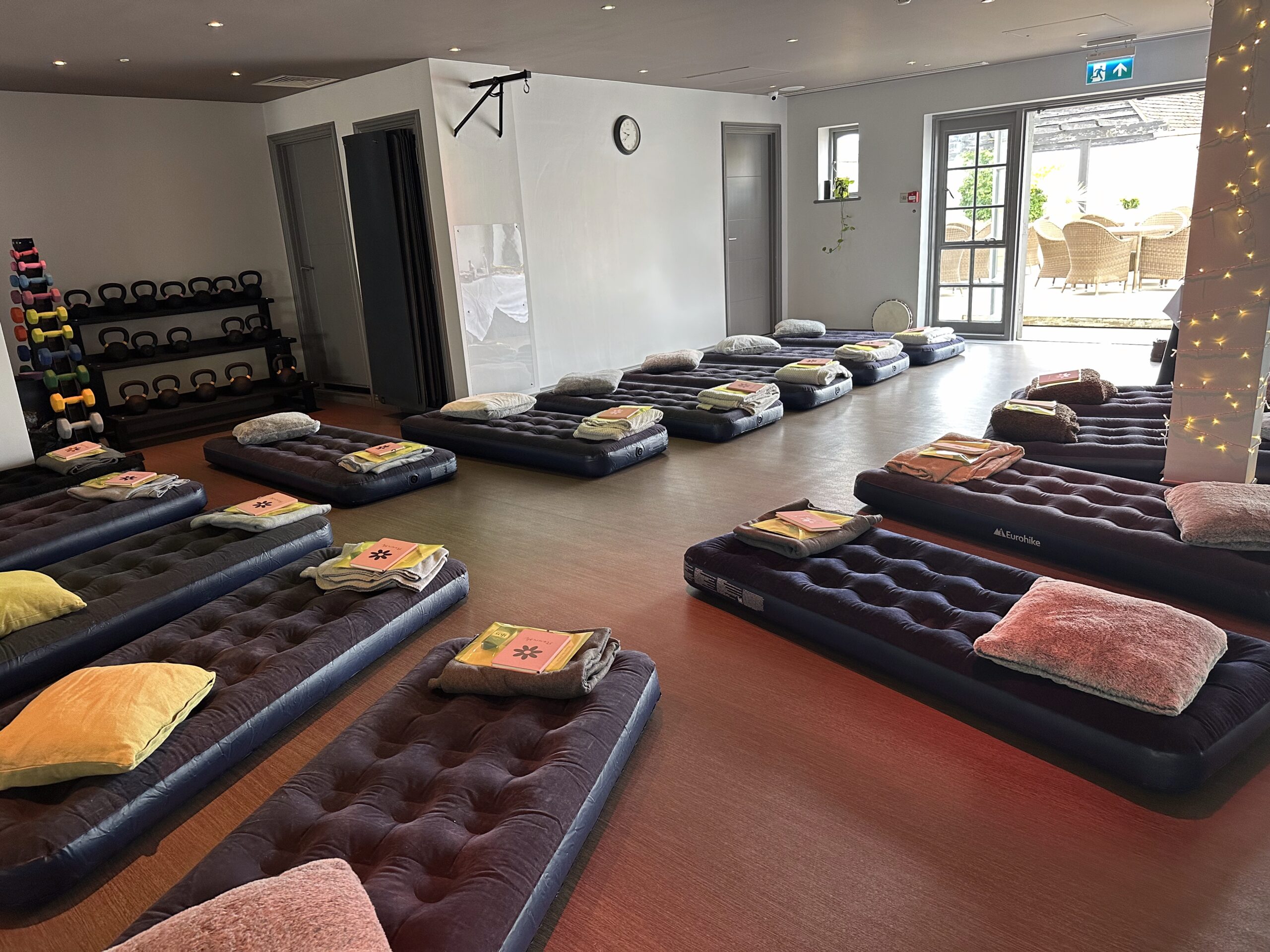 - Yoga mats, inflatable mattresses, bolsters, cushions, blankets and eye masks for comfort.